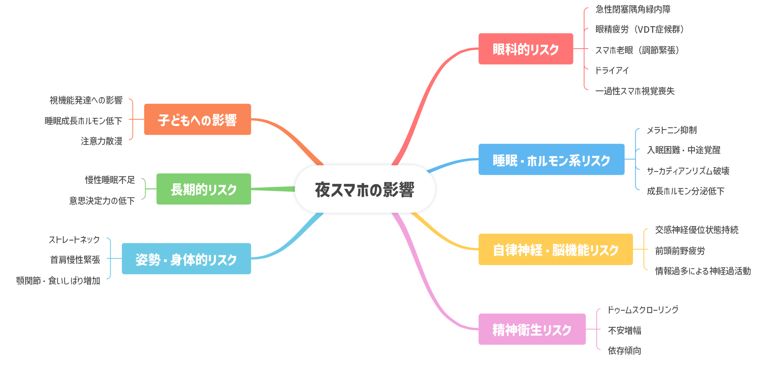 夜スマホによる弊害をそれぞれのパターンで分けてまとめました。