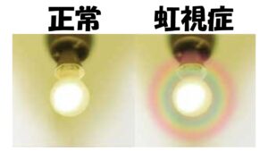 そして、視界が急にかすみます。白い霧がかかったように見えたり、電灯のまわりに虹のような輪が見えたりします。