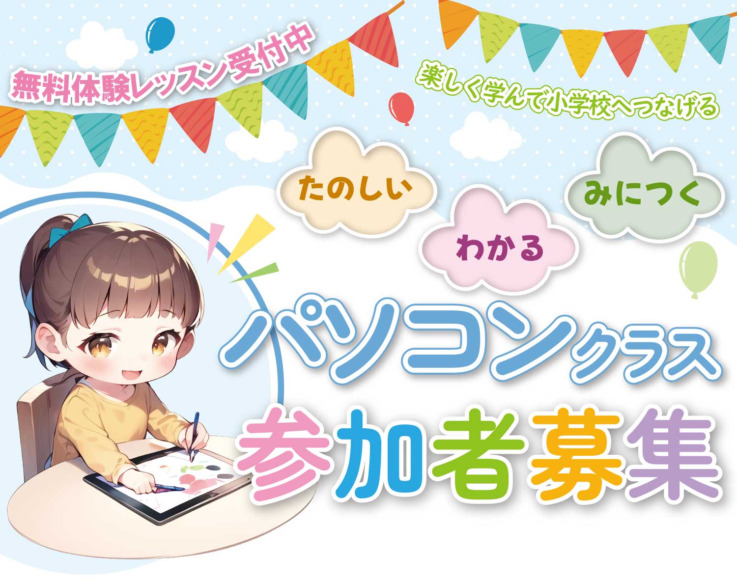 学習の過程で、アルファベットに慣れてきたら、ローマ字や、キーボード入力などを行いながら、画像を入れたり、小学校で行う内容を進めていきます。ただ、デジタルスキルという事に縛られる訳ではなく、頭を使って、論理的に考えられる事を大切に指導していきます。
